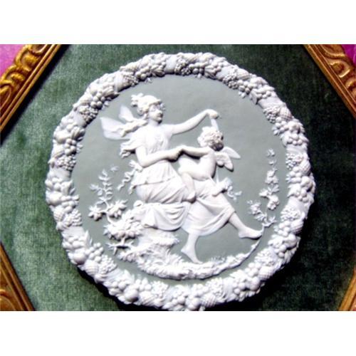 BEITIFULLY DONE PERIAN WARE PLAQUE. THE IMAGE IS LOVELY, A WINGED LADY (ANGEL) PLAYING WITH A CUPID IN A GARDEN, TRIMED BY ELABORATE GARLAND. THE PLAQUE ITSELF IS 7" SET ONTO A GREEN VELVET BACKGROUND, WITH A CARVED WOOD AND GOLD LEAFED OCTAGON FRAME.SO WELL DONE IN PERSON IT LOOKS SIMILAR TO A VICTORIAN CAMEO.