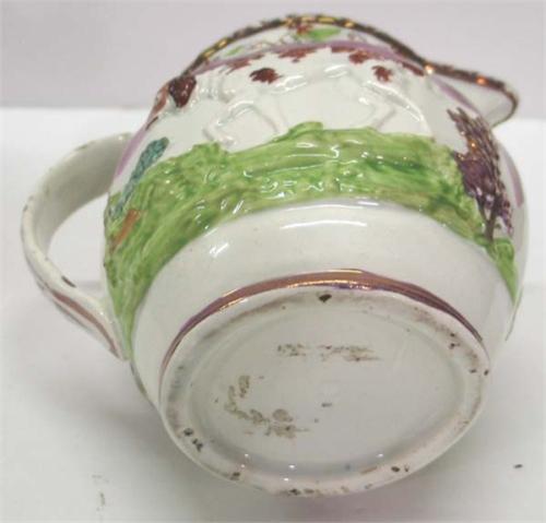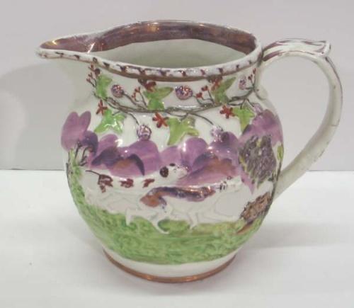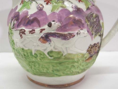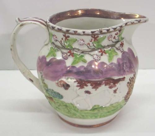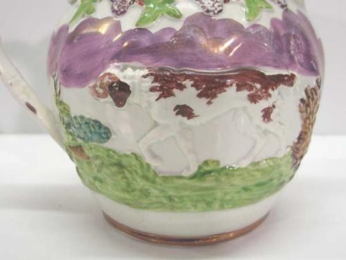 ENGLISH PORCELAIN CREAMER. Purple luster and relief decorated scene depicting dogs in forest. Shows loss to paint and luster. No mark. 4.75” H