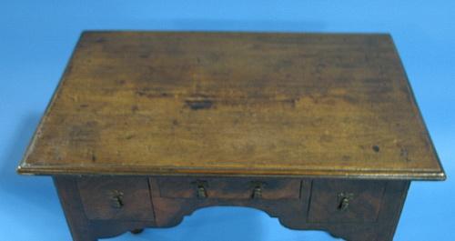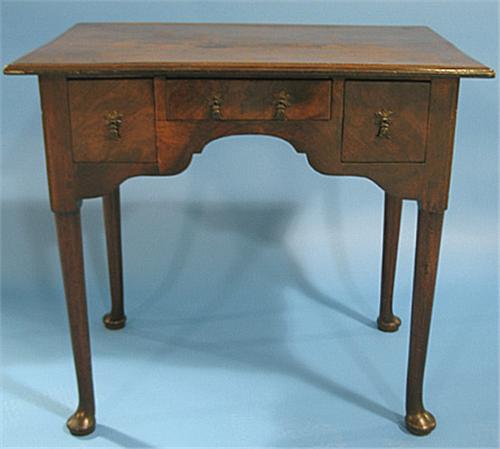 PERIOD ENGLISH QUEEN ANNE WALNUT DRESSING TABLE. Single drawer at center and drawers at both sides. Drawers are dovetailed. Pegged construction. Oak secondary wood. Overall good condition with top showing some signs of wear. 28" H, 30.5" W, 20" D
