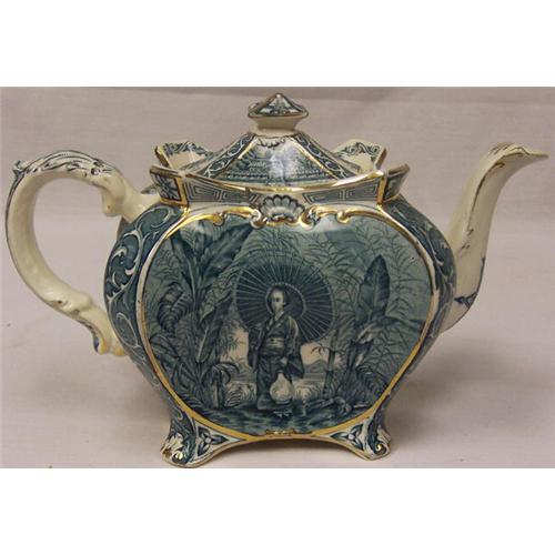 THIS IS A WONDERFUL OLD ENGLISH "LIKE" IRONSTONE TEAPOT. IT HAS THE MOST BEAUTIFUL ALMOST "LIKE" CHINESE PICTURE ON THE FRONT. IT PICTURE'S A LADY CARRYING A VESSEL AND SHE IS WEARING A ROBE.THE LID HAS A LARGE GRASS HUT ON IT. IT IS REALLY DIFFERENT FOR BEING ENGLISH. INSIDE THE TEAPOT TOWARD THE HANDLE ARE SOME LIGHT CHIPS. THE COLORING IS CREAM AND GREEN, VERY BEAUTIFUL! YOU TEAPOT COLLECTOR'S CHECK THIS OUT IT IS WONDERFUL AND WOULD BE A PRIZE TO OWN.