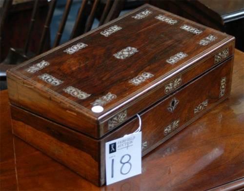ENGLISH ROSEWOOD LAP DESK veneer losses to left side mid-19th century<BR><BR><BR>Packing and Shipping: $30