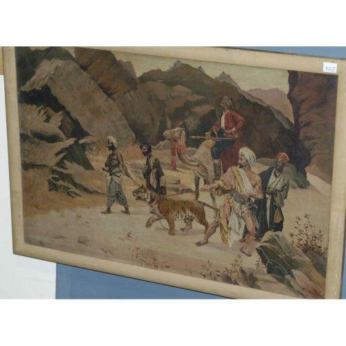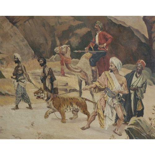 ENGLISH SCHOOL, 16"x24" oil on canvas, Capturing the Tiger, late 19th century, CONDITION REPORT: yellowed varnish, otherwise good. PACKING AND SHIPPING: We offer packing (double boxed in most cases) and shipping of this item within the Continental United States by USPS or UPS (our choice- boxes over 30lbs or oversized may be recalculated based on buyer's location), NOT INCLUDING INSURANCE (it will be added when we know the sales price) for $40