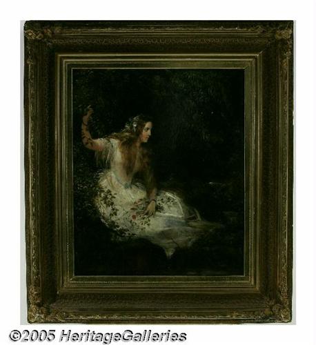 <B>ENGLISH SCHOOL (19th Century)</B></I><BR>Ophelia<BR>Oil on canvas<BR>30in. x 24.5in<BR><BR>Condition Report: Painting has been lined, significant lifting and flaking throughout surface in darker areas particularly in the top right and lower left, some minor paint loss (1-2mm) in top right, previous restoration finely inpainted craquelure in center and lower areas of canvas, other areas of minor inpainting around edges.<BR><BR>David Dike: Agree with description, condition and value estimate.<BR>Brian Roughton: No comment. Condition as noted.<BR>