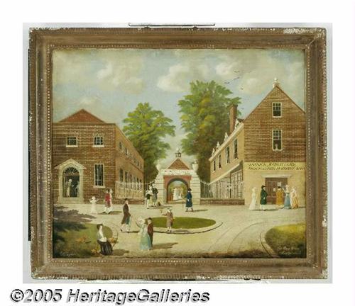 <B>ENGLISH SCHOOL (19th Century)</B></I><BR>The Pump Room, Cheltenham Spa<BR>Oil on canvas<BR>25in. x 30in.<BR>Signed lower left 'E.G. Pegrum'<BR><BR>Condition report: Canvas is wax-lined, several patches (8) of varying sizes on reverse, tears throughout lower area significantly overpainted, overall yellowing from old varnish<BR>