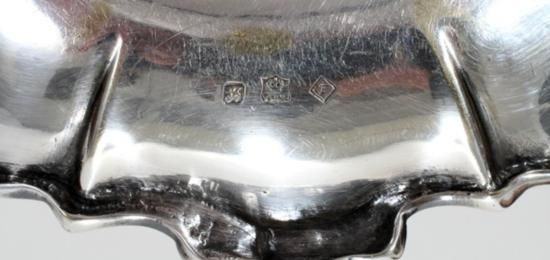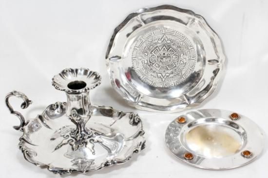 ENGLISH SILVER CHAMBER STICK, H 3 3/4in, W 7 1/2in, & SILVER PLATES, TWO:Including 1 Arts and Crafts style chamber stick with date letter S, shield enclosing a crown over ~IB & S~ and an F enclosed in a diamond (import mark, see additional photo). Together with 2 silver plates, Dia.5in & 6in. Three pieces total. MWF2389