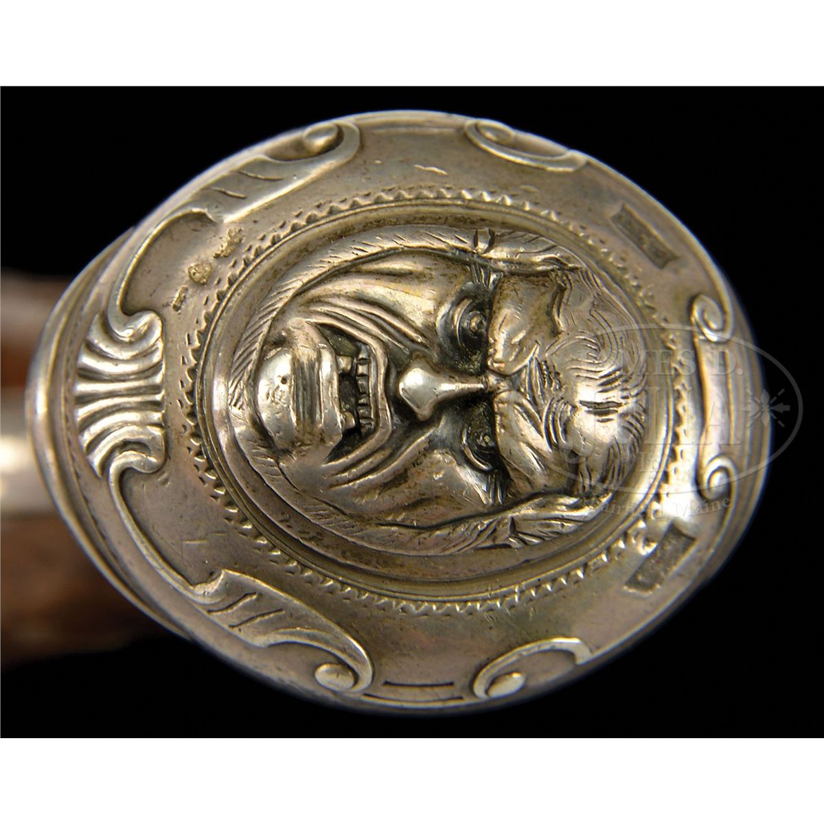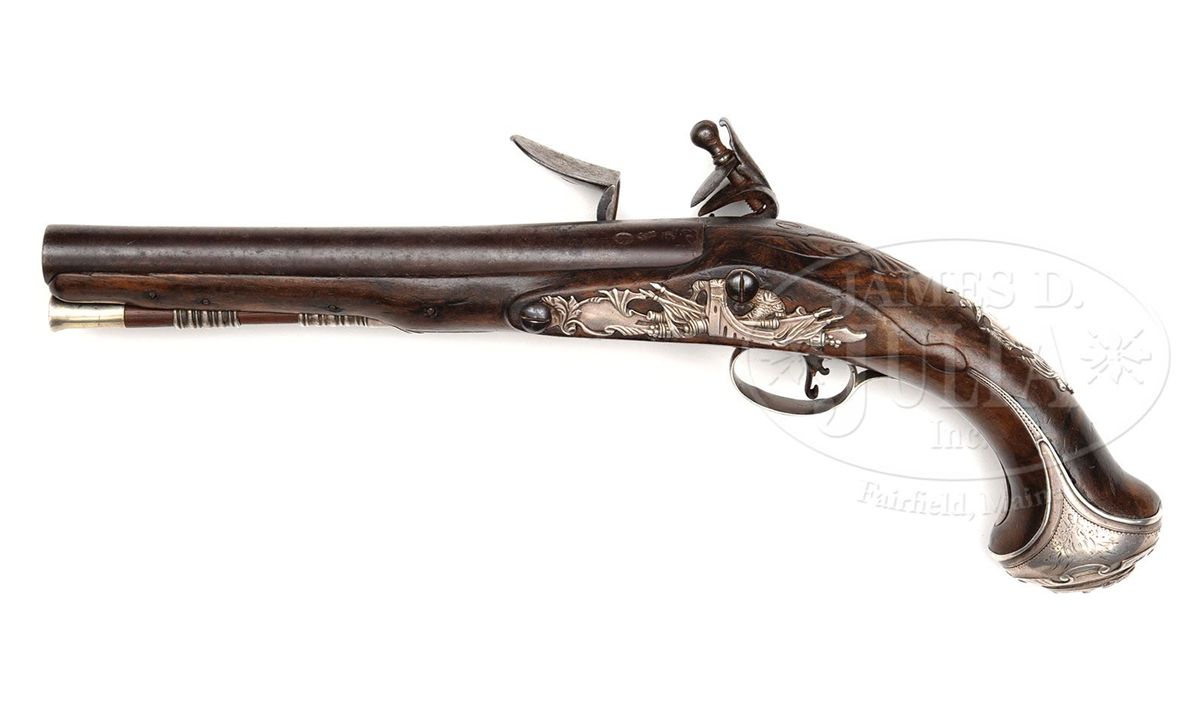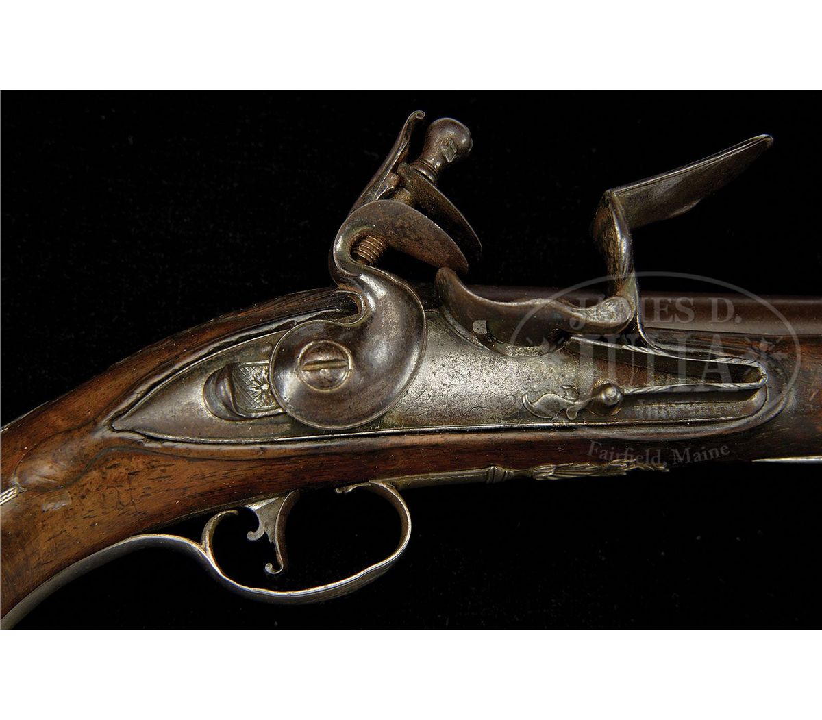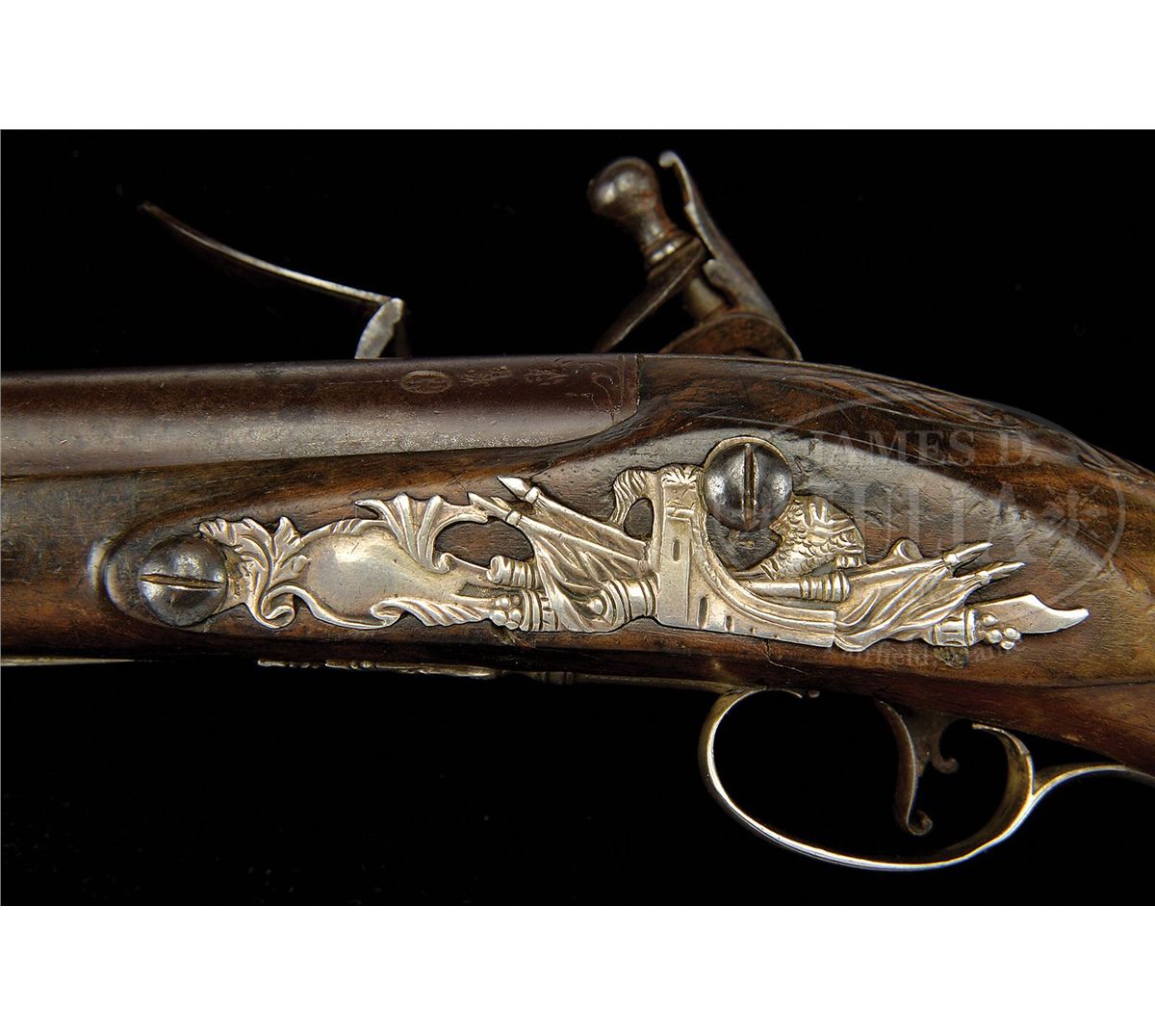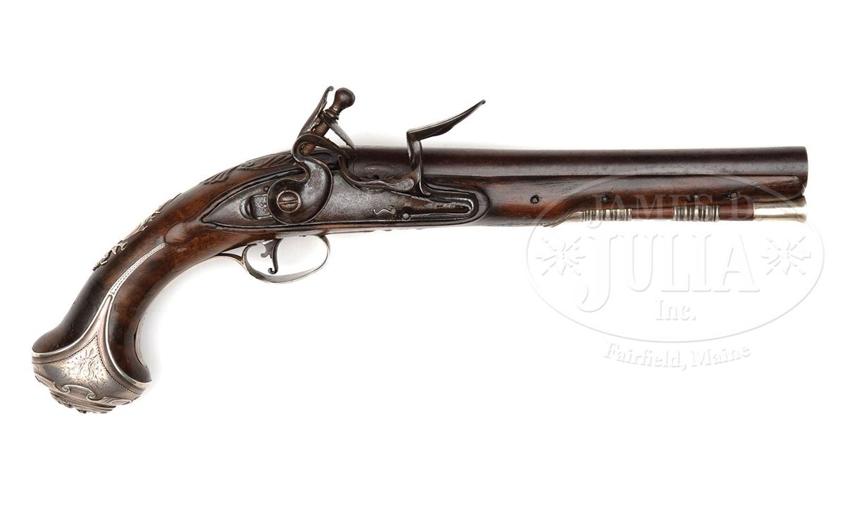 NSN. John Bumford is a well known London maker working prior the the Revolutionary war. This officers pistol is fully silver mounted and well hallmarked. Lock has a push on safety, bridled pan and well formed gooseneck lock. Bbl is typical English form. Silver ramrod pipes are well turned. Silver sideplate is cast and chased with a castle and panoplys of arms. Bbl has London gunmakers proofs with "IB" for John Bumford. CONDITION: Bbl is deep aged brown. Signature is faint but legible. Lockplate is deep aged brown as well with signature indistinct. Silver mounts are crisp and unrubbed with spurred buttcap and finely cast grotesque mask butt. Figured walnut stock is fine with only a few minor splits and losses mostly around bbl and ramrod pipe pins. 4-49382