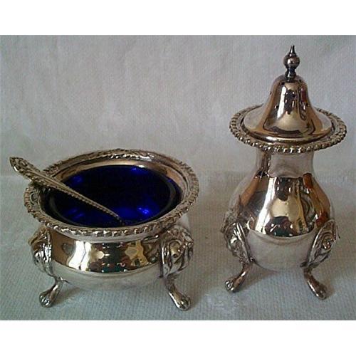 AN ADORABLE OPEN SALT WITH ORIGINAL COBALT LINER AND SPOON STANDING 1 3/4" TALL WITH A 2 3/4" DIAMETER. PEPPER SHAKER STANDS 4" TALL. GADROONED EDGES AND PAW FEET WITH FIGURAL HEADS ATOP EACH LEG. CONDITION IS VERY GOOD; NO DENTS OR REPAIRS; SOME PLATING LOSS UNDER THE COBALT BOWL OF THE SALT CELLAR. TOP ON PEPPER SHAKER FITS SNUGLY. MARKED ON BOTH SALT AND PEPPER: SHEFFIELD REPRODUCTION, MADE IN ENGLAND. A CHARMING ADDDITION TO YOUR TABLE, OR A WONDERFUL HOSTESS GIFT. ADDITIONAL PHOTOS AVAILABLE UPON REQUEST. WE ARE WELL EXPERIENCED IN PACKING/SHIPPING WORLDWIDE, WHICH IS NOT EXPENSIVE FROM MONTREAL, CANADA.