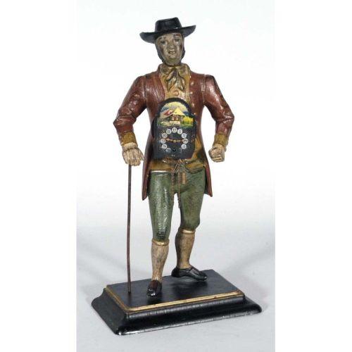 ENGLISH STATUE CLOCK 15 1/2" high, late 19th/early 20th century, CONDITION REPORT: not running, otherwise excellent, PACKING AND SHIPPING: Fairfield Auction will provide packing and shipping (excluding insurance) within the Continental U.S. for $20. Buyer is welcome to use any other service or pick-up at the gallery.