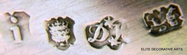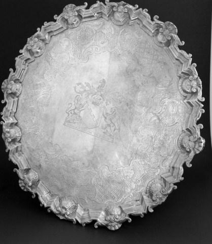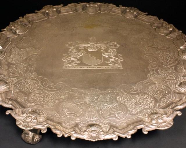 Incredibly detailed English sterling silver platter. Has a beautiful chased scroll design on platter. Border has fabulous shell design. Measures 1 1/4" height x 12" diameter. Has the date mark of 1864. Holds the London Town marks. Also marked DW. Perhaps Daniel Welby. Has a crest etched in the center that says "Honor Virtutis Praemium" which mean "Honor is the reward for virtue".