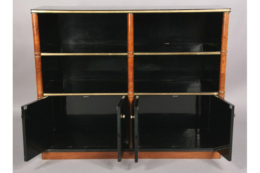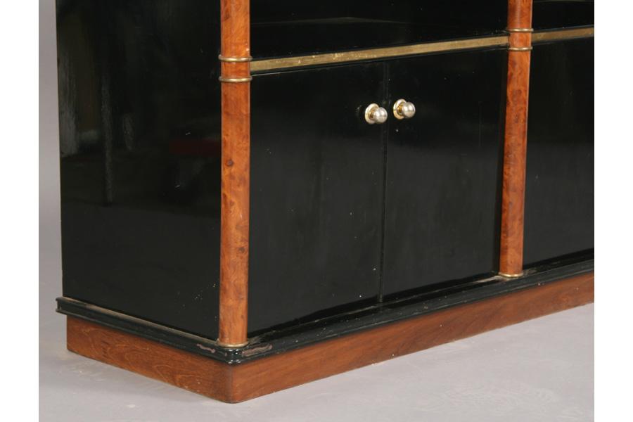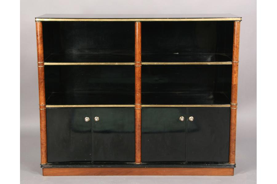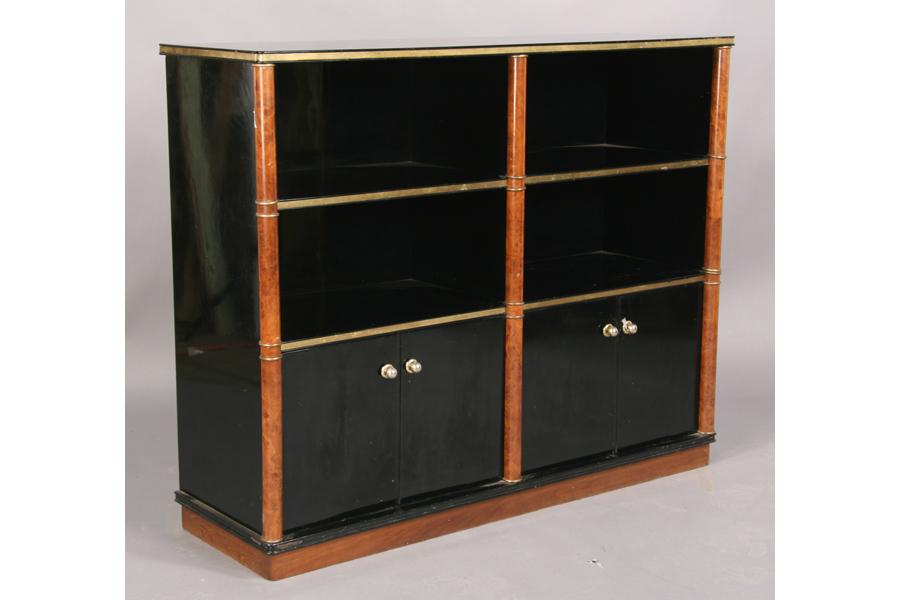 Interesting English style ebonized bookcase with bronze trimmed top edge and burled columns with open shelves and four cabinet doors circa 1950. Ht: 42" Width: 51" Depth: 16" ***PLEASE NOTE: All property shall be paid for by the purchaser within five (5) business days of the sale. Kamelot Auctions accepts cash (In house only), personal checks, certified checks and money orders. We do not accept credit cards or Paypal under any circumstances. Please note our policy regarding payments from International buyers: The only acceptable method of payment is a bank wire/bank transfer. For invoices more than $1000, there is no additional fee for this service. For invoices less than $1000, please include an additional $25 wire fee. We will be happy to forward our bank wiring information after the completion of the auction. Thank you for your understanding and cooperation. All purchases must be removed within 15 business days after an auction. Property not removed from our facility after 15 business days will be moved to an off-site storage facility at a charge of $10.00 per day payable by the buyer. Kamelot does NOT provide shipping services or estimates. However, we recommend the following independent shipping services: Antique Transport Co. at antiquetransport@cs.com, Farren Transport at farrentransport@comcast.net or All Points Shipping at jb@allpointsshippingnj.com for quotations and shipping arrangements for furniture and other large items that would require a blanket wrap shipping company. For quotations and shipping arrangements for smaller items that would traditionally be shipped through UPS, please contact The UPS Store at store4744@theupsstore.com or The Packaging Store at hrpa112@aol.com. Clients are welcome to pick up their items from our location or make their own shipping arrangements.