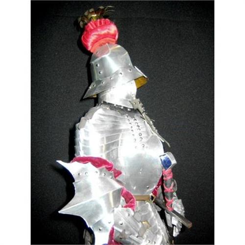 THIS IS A GREAT PIECE FOR A LIBRARY OR AN ENTRANCE HALLWAY. THE ARMOUR WORK IS REALLY VERY NICE AND UNUSUAL, THE SWORD PULLS OUT TO USE AS A LETTER OPENER, AND THE END OF THE HANDLE HAS A JASPER STONE PLACE IN.TOP OF THE HELMET HAS VELVET AS DOES THE ARMS.IT SITS ON A WOODEN STAND WITH A PLAQUE THAT SAYS OXFORD ENGLAND.THE PIECE IS QUITE STURDY AND DOES HAVE VERY GOOD WEIGHT TO IT. THE METAL WORK IS VERY WELL DONE AND REALISTIC.GREAT GIFT FOR THAT PERSON WHO HAS EVERYTHING.