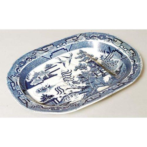 1 ENGLISH TRANSFERWARE "WELL AND TREE" DISH, 18" long, CONDITION REPORT: big chip to foot