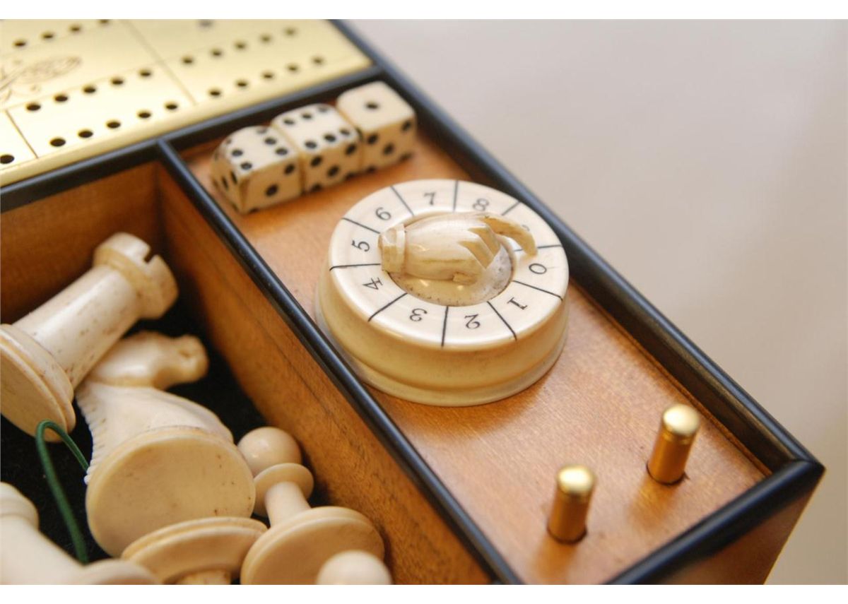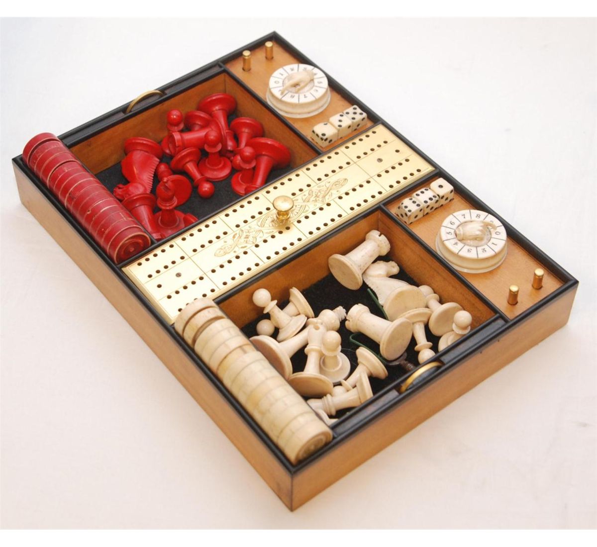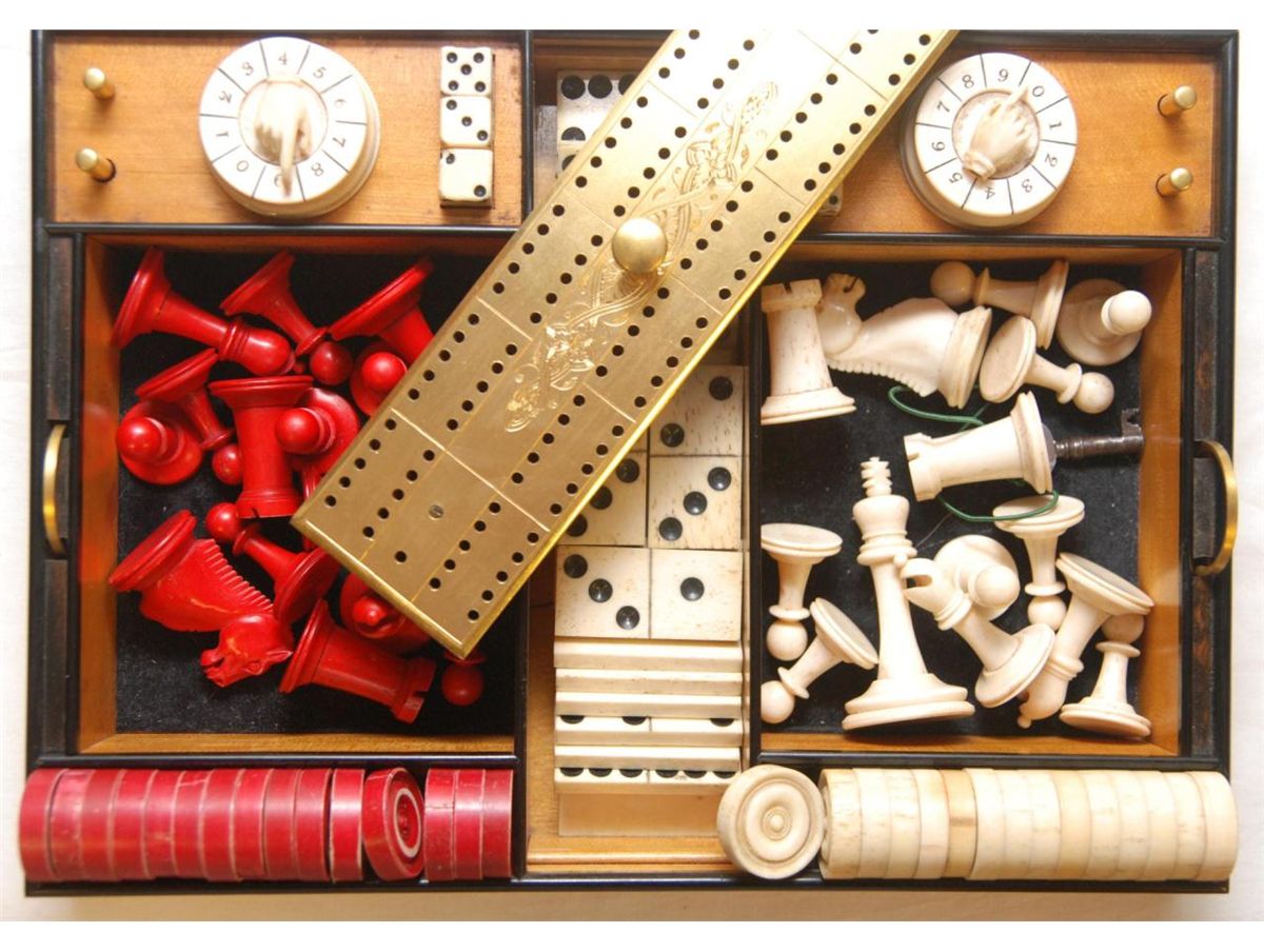 An old English Victorian Coromandel game compendium. Old game having various games with pieces and boards made of ivory, bone and wood. Includes fitted wooden brass clad locking box. Key included. Mid to early 20th century. Measures 6 1/2" height x 12 1/2" width x 9 5/8" depth (16.5cm x 31.7cm x 24.4cm). Total weight of 6.44 kilograms.