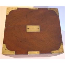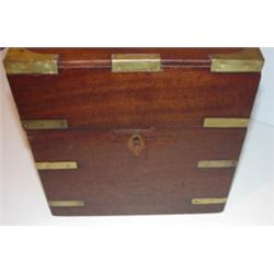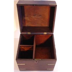 English walnut tea caddy. Brass hinges and original lock and latch. Brass plate on top. Three divided compartments on inside. 8.25" H, 8.5" W, 7.5" D