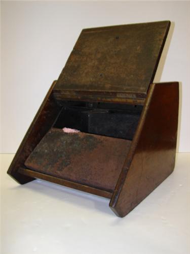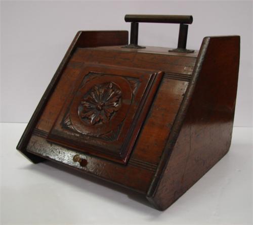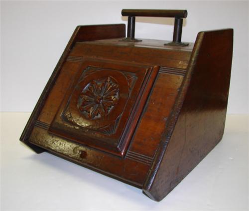 ENGLISH WOODEN COAL SCUTTLE. Lift-top features carved floral decoration. Has handle at top. 11.5” H, 13” W, 15.5” D