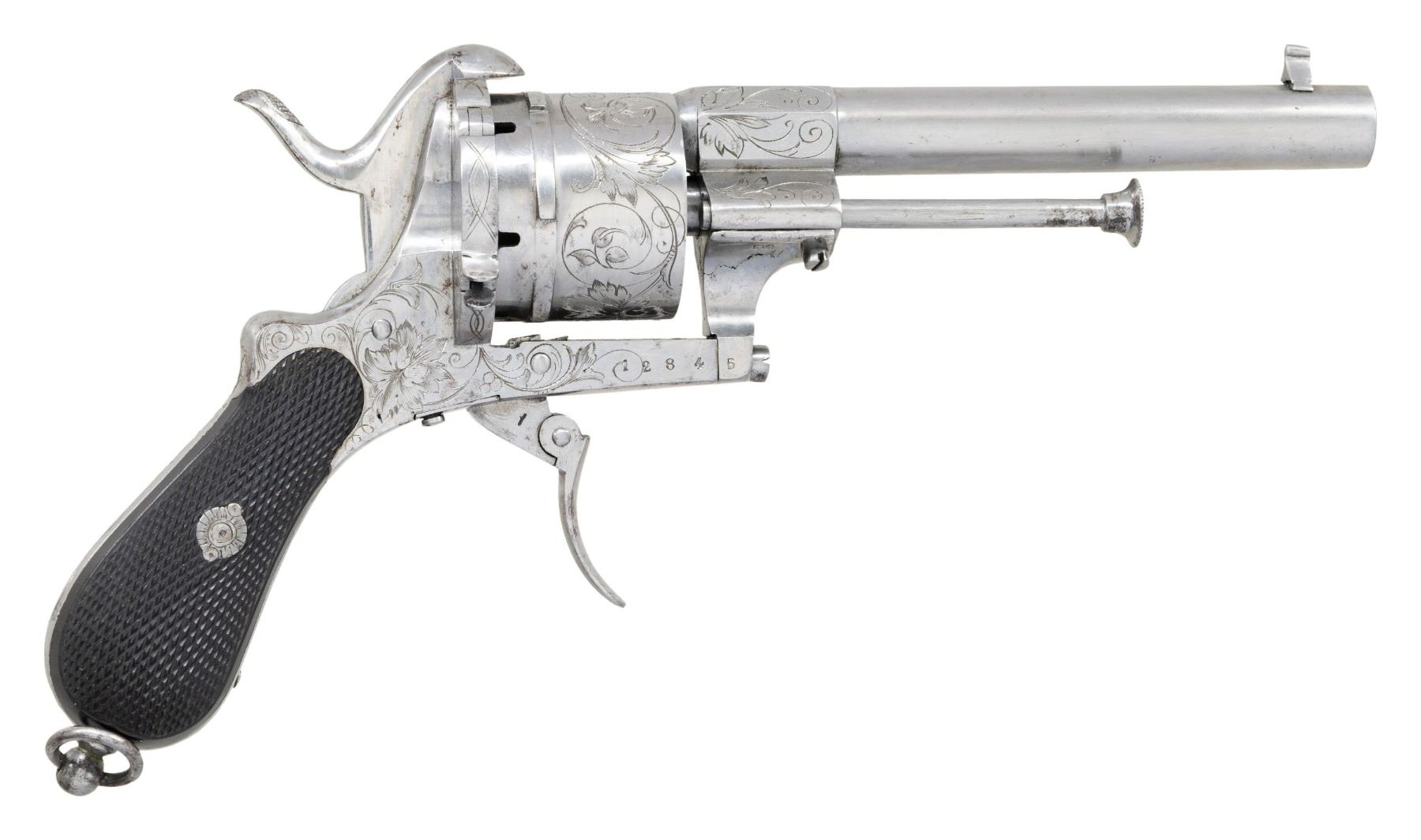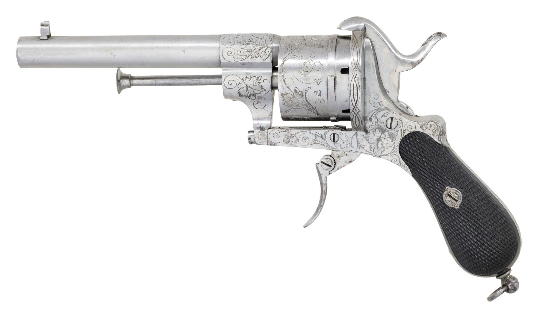 PINFIRE REVOLVER. Cal. 9mm Pinfire. S# 12845. Bbl. 4 1/4". Folding trigger double action pinfire revolver produced by an unknown mfg. in Belgium. Right side of frame is marked with the S#, with the last digit "5" stamped on the bbl. Frame, cyl., and bbl. exhibit Belgian proofing and feature light foliate / floral engraving overall. Metal components have been cleaned and polished in-the-white. Frame is mounted with 2-piece checkered wood grips, each marked "III" on their interior in pencil, and features a lanyard swivel and ring on the butt. Right side of bbl. with ejector rod. Dovetailed blade front sight with hammer notched rear sight. Rear of cyl. is stamped "5". CONDITION: metal components are good, as cleaned and polished in-the-white, showing some light pitting. Engraving remains sharp. Bore is bright, exhibiting some scattered spots of mild pitting, while retaining fair to good rifling throughout. Proper manual mechanics in SA and DA. Grips show light smoothing, but otherwise remain sound. PROVENANCE: Estate Collection of Nicholas Apergis. (01-27525/MLW). ANTIQUE. $400-600.