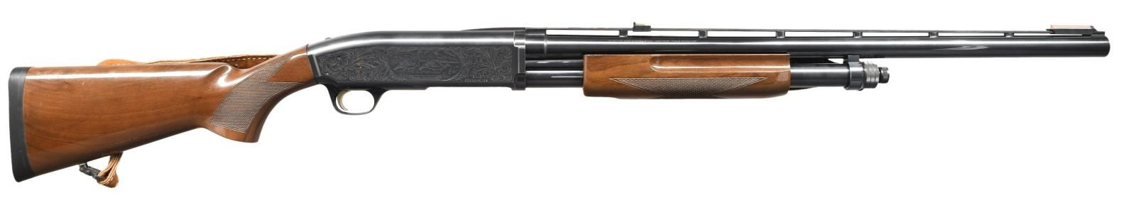 SHOTGUN. Cal. 10 GA, 3 1/2". Bbl 26". Blued finish w/ checkered wood buttstock and pump. Left and right sides of receiver feature scroll engraving surrounding a game scene. 26" bbl features a VR w/ a red fiber optic front sight and green fiber optic U-notch rear sight. Sling loops are fitted w/ an unmarked brown leather sling.CONDITION: metal components retain the majority of their original factory blue finish, exhibiting mild wear and edge wear from use, scattered superficial marks from handling, as well as scattered spots of mild surface oxidation overall. Mirror bore. Wood furniture shows scattered nicks and handling marks, but is otherwise good. PROVENANCE: From the personal collection of Brad Shepherd. (23-2101/MLW). MODERN. $400-700.