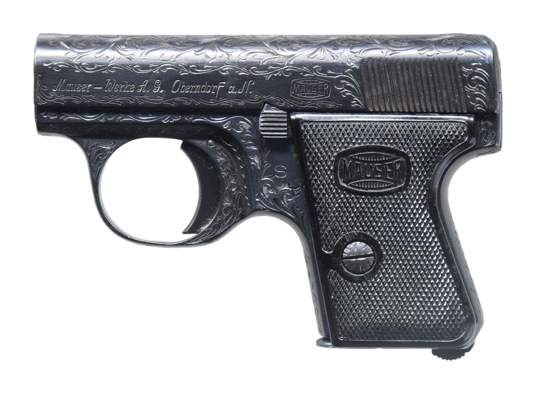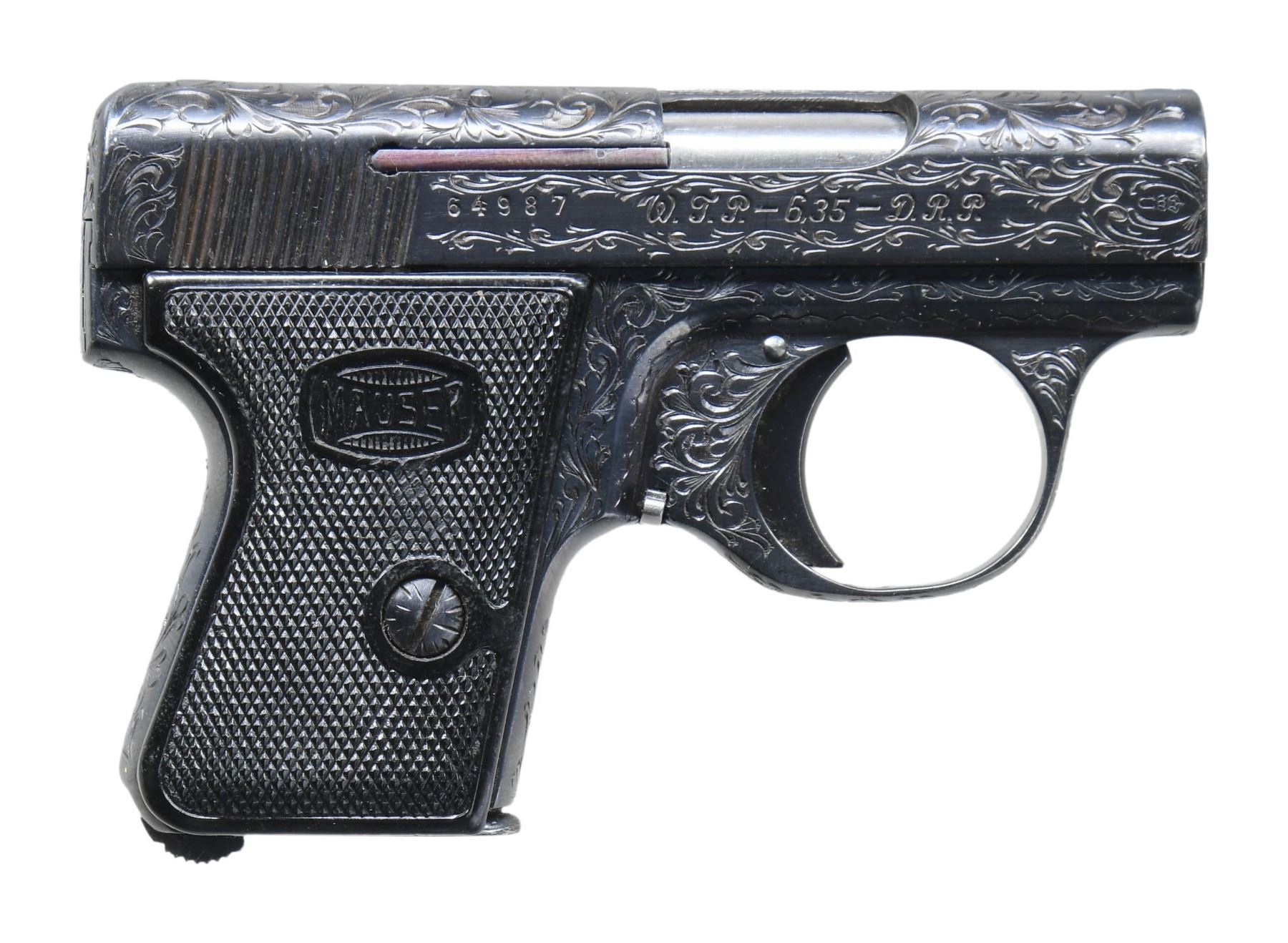 POCKET PISTOL. Cal. 6.35mm. S# 64987. Bbl. 2". WTP II (Westentaschenpistole "Vest Pocket Pistol") semi-automatic pistol mfg. by Mauser. The left side of the slide is marked "Mauser-Werke A.G. Oberndorf a.N.", followed by the Mauser banner logo, with the S# and "W.T.P.-6,35-D.R.P.", followed by a double crowned "U" proof marked on the right. Frame and slide feature foliate scroll engraving that extends to the grip straps, with a wavy line and dot design engraved along the edges of the trigger guard on the frame. Metal components exhibit a professionally reapplied blue finish overall, save for on the bbl., which is polished in-the-white. Frame is mounted with 2-piece Mauser banner checkered black synthetic grips. Slide features a sight groove, with an integral blade front sight and U-notch rear sight. MAGS: 1 reblued 6-rd. mag. with 5 indicator holes. CONDITION: metal components retain virtually all of their blue finish overall, exhibiting a few spots of light edge wear. Mirror bore, exhibiting well defined rifling throughout. Proper manual mechanics. Grips show light smoothing, with some scattered superficial handling marks. (25-4243/MLW). CURIO. $400-600.