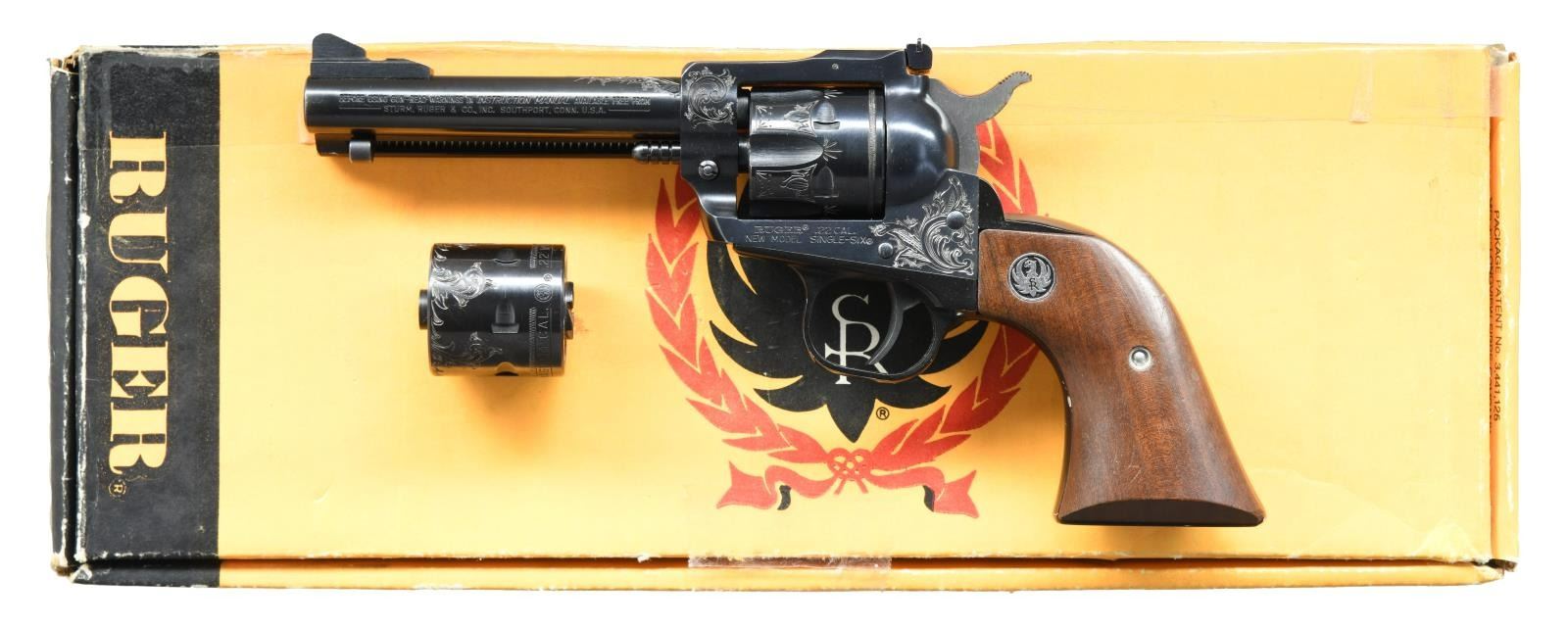 Cal. 22 LR / 22 Mag. S# 69-99733. Bbl. 4 5/8" w/ factory screw attached serrated ramp sight; frame mounted adjustable rear. Mfg. 1983 in scarce, desirable bbl. length w/ blued finish plus walnut grips having silver eagle medallions. Nicely engraved frame, cyls. & top rear of bbl. by Brian Weaver (per consignor); grip frame & ejector rod housing retain factory anodized black finish. UNATTACHED ACCESSORIES: factory yellow & black cardboard box having clear tape repairs to include reattachment of end label. Near excellent matching engraved 22 Mag. cyl. CONDITION: very good to excellent overall having light marks showing mainly on anodized parts. Steel components, bore & grips are near excellent; slight evidence of firing & use within frame. Cyl. base pin missing captive plunger to operate transfer bar (readily available from Ruger). (23-4905/NW). MODERN. $600-900.