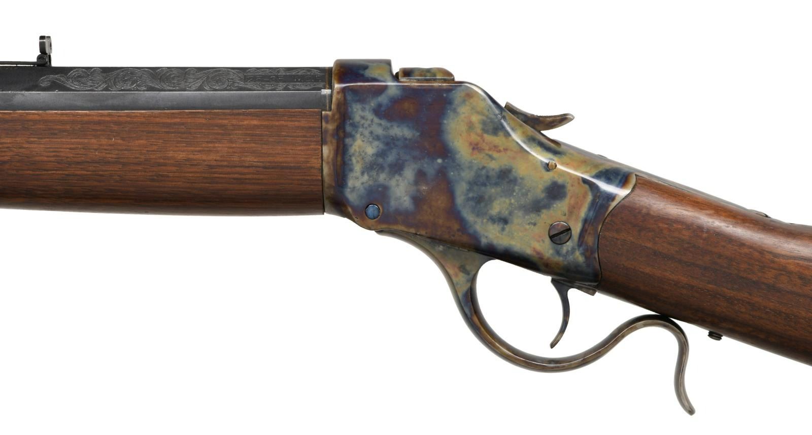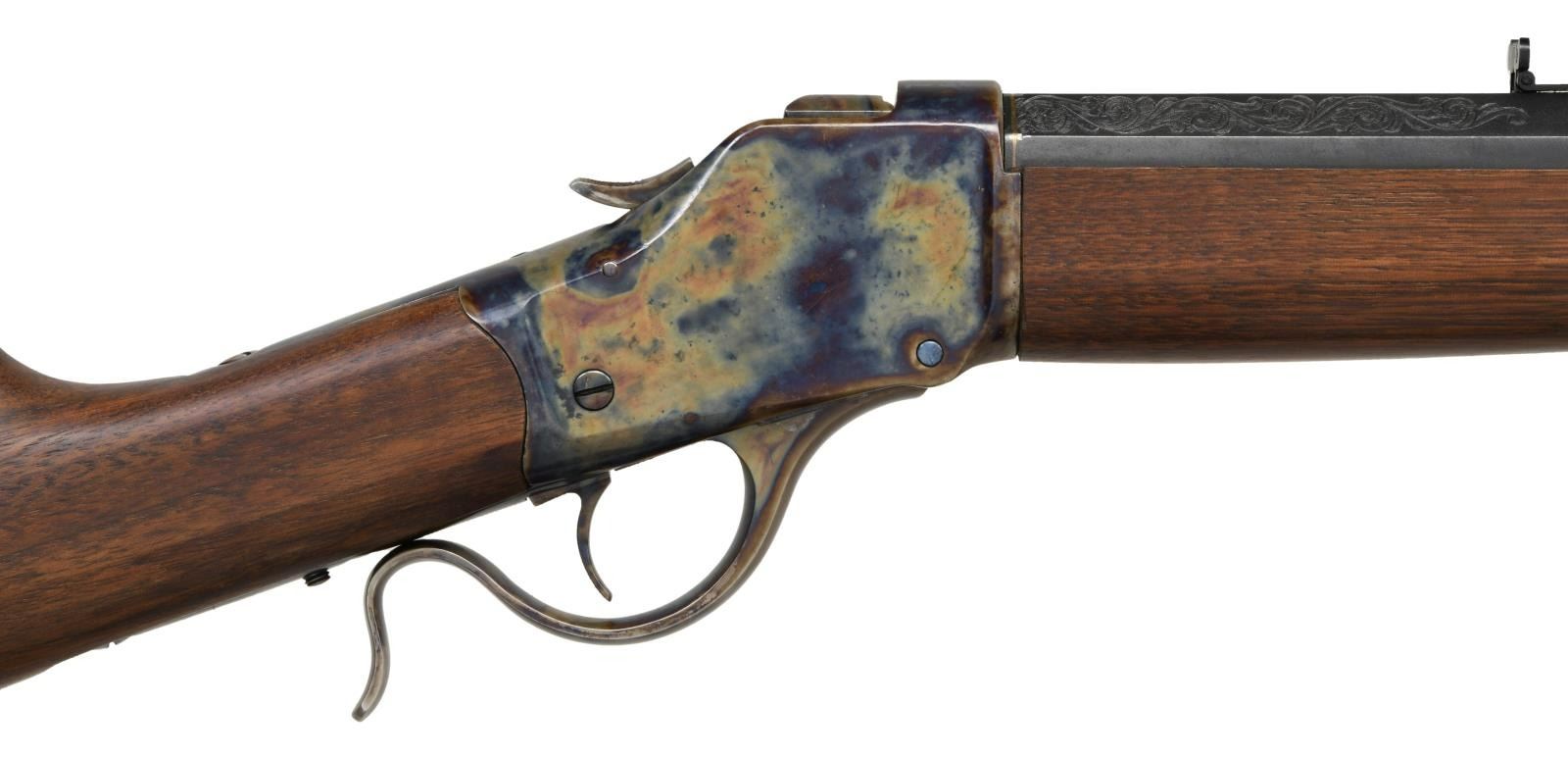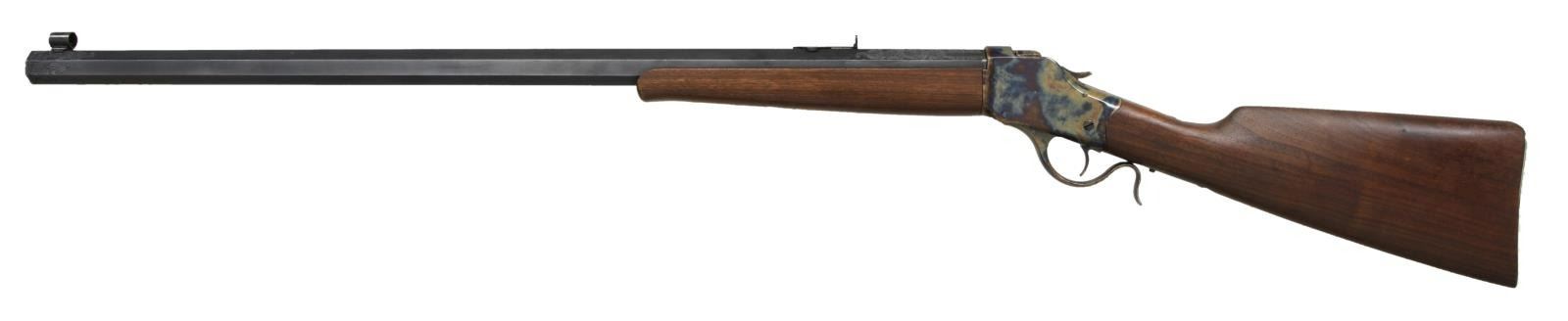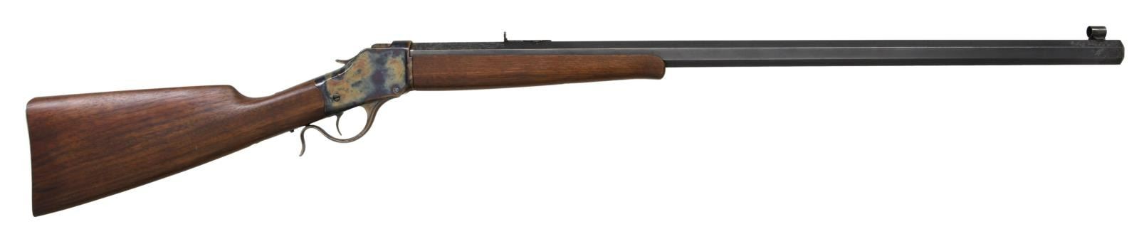 SHOT RIFLE. Cal. 25-35 WCF. S# 123785. Bbl 29 7/8". Model 1885 High Wall single shot rifle manufactured by Winchester after World War I. The full length heavy octagonal barrel is stamped with Winchester's 2 line address over the top flat, with the caliber designation marked on the left flat at the breech. The entire rifle has been pleasantly restored, with the receiver, breechblock, hammer, trigger, and lever exhibiting a reapplied case color hardened finish, and the barrel a reapplied blue finish. The barrel features aftermarket scroll engraving on the upper 3 flats at the breech, with additional engraving present on the flats at the muzzle. Breech and muzzle both exhibit a single gold band. Dovetailed globe front sight with dovetailed Marble's flip-up U-notch rear sight. Barrel has been drilled and tapped over the address. Replacement plain straight grip wood buttstock with contemporary checkered steel buttplate, and replacement smooth wood ebony inlaid schnabel tip forend. CONDITION: excellent, as restored, with metal components retaining bountiful amounts of their reapplied case color hardened and blued finishes, exhibiting few spots of light wear, as well as some areas of mild pitting beneath the finish. Mirror bore, exhibiting well defined rifling throughout. Wood furniture shows a few light marks from handling and storage, but otherwise remains sturdy and serviceable. PROVENANCE: The Collection of Gun Sport Ltd. owned by Jon R. Thomas. (23-3228/MLW). CURIO. $1,000-1,500.