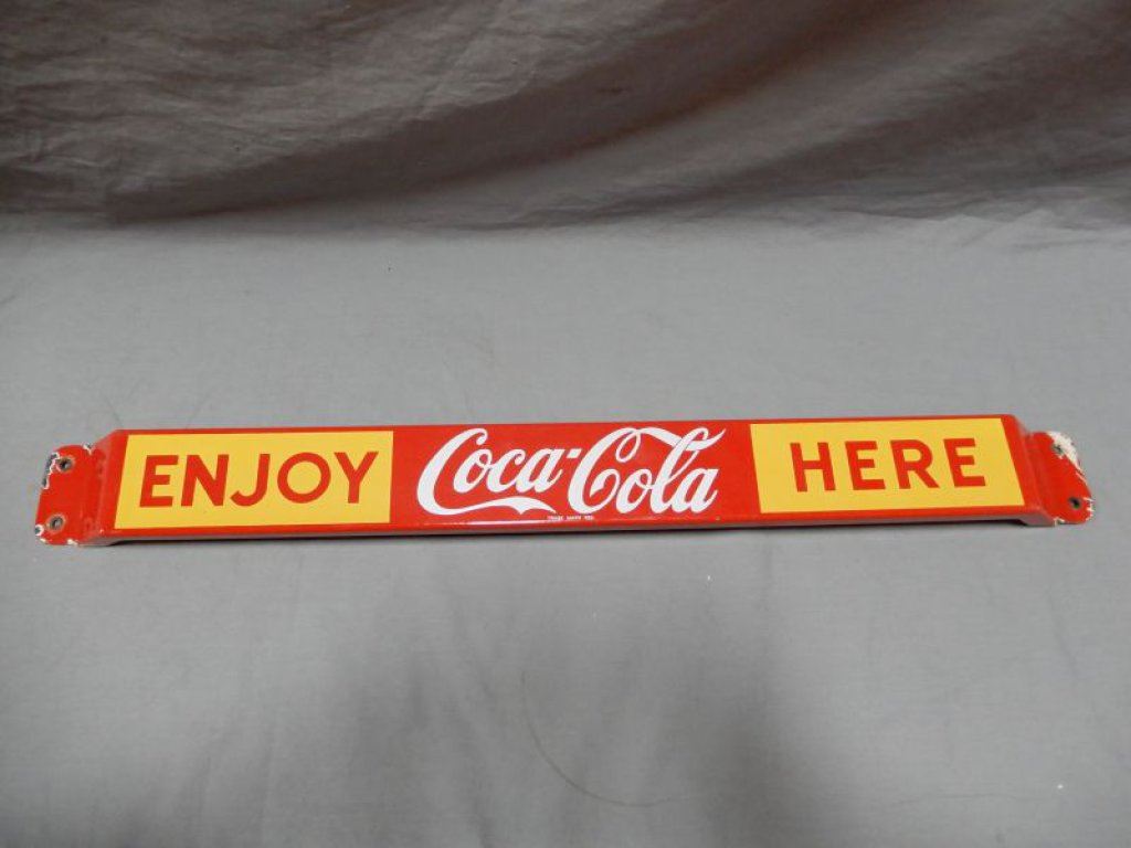 ENJOY COCA-COLA HERE PUSH BAR MADE IN CANADA- 31 1/2" X 3 1/8" HANGER HOLE PORC. LOSS LOCATION: UPPER BACKROOM