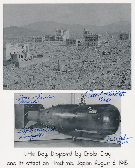 A great composite S.P. 8" x 10" b/w, top image shows the devastation of Hiroshima after the blast on Aug. 6, 1945, while the bottom shows "Little Boy", the bomb which caused the destruction. Signed by four members of the Enola Gay crew, each of whom adds their titles: PAUL TIBBETS, DUTCH VAN KIRK, TOM FEREBEE and DICK NELSON. Fine.
