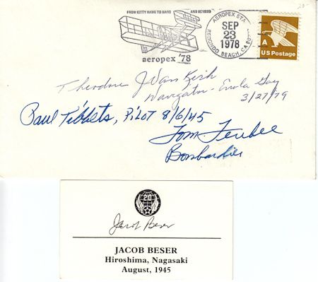 Great item signed by three members of the crew of the Enola Gay, the plane which dropped the atomic bomb on Hiroshima on Aug. 6, 1945. Signers include Pilot PAUL TIBBETS, bombardier TOM FEREBEE, and navigator THEODORE VAN KIRK have all signed a 1978 Aeropex commemorative cover. With an additional person autograph card signed by JACOB BESER. Fine condition.