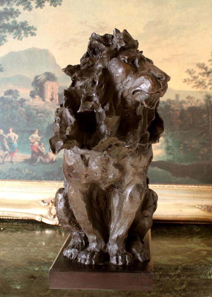 Lion with Blowing Mane, Bronze Sculpture, 19"H x 25"W x 9"D 50lbs This bronze sculpture was produced using the "Lost Wax" casting method. The"Lost Wax" Cast method is the most precise metal casting technique in existence, ensuring exquisite detail of the original host model which is usually sculpted in clay or wax. This "Lost Wax" casting method is an extremely labor intensive and expensive process, but the end results produce a Heirloom Quality Masterpiece!