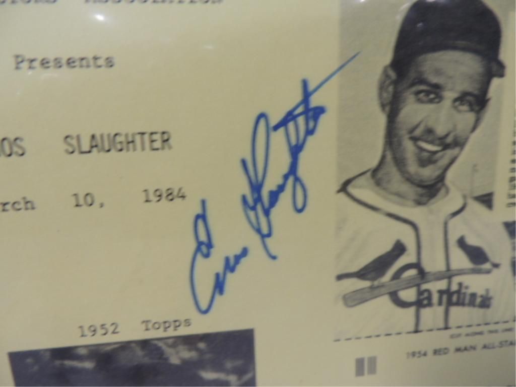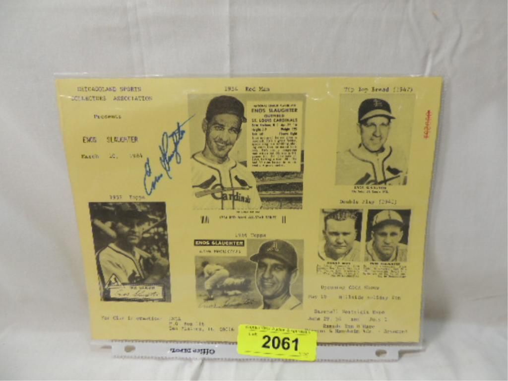 CHICAGOLAND SPORTS COLLECTORS ASSOCIATION FLYER AUTOGRAPHED BY ENOS SLAUGHTER. AS SHOWN. SEE PHOTO FOR MORE DETAILS. PLEASE BE ADVISED, AND INFORMED REGARDING SIGNATURES OR AUTOGRAPHS THAT WE SELL AT AUCTION: WE ARE NOT AUTHENTICATORS, AND WE DO NOT AUTHENTICATE, OR VALIDATE ANY AUTOGRAPHS OR SIGNATURES THAT WE OFFER AT AUCTION. SOME AUTOGRAPHS OR SIGNATURES MAY COME WITH AN AUTHENTICATION FROM ANY ONE OF LITERALLY HUNDREDS OF AUTHENTICATORS ACROSS THE COUNTRY, AND AROUND THE WORLD. WE DO NOT ENDORSE ANY AUTHENTICATOR, NOR DO WE GUARANTEE THAT ANY AUTOGRAPH OR SIGNATURE IS AUTHENTIC, OR THAT IT WILL PASS AUTHENTICATION BY ANY AUTHENTICATOR. ALL AUTOGRAPHS OR SIGNATURES ARE SOLD