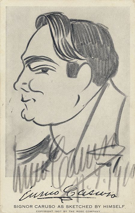 (1873 - 1921) Italian tenor, very possibly the greatest of all time. His repertoire included over 40 operas such as I Pagliacci and La Boheme. Postcard image of a self-portrait of Caruso, 3 1/4" x 4 1/2", boldly signed in dark, thick pencil and dated Sep. 11, 1910. Fine.