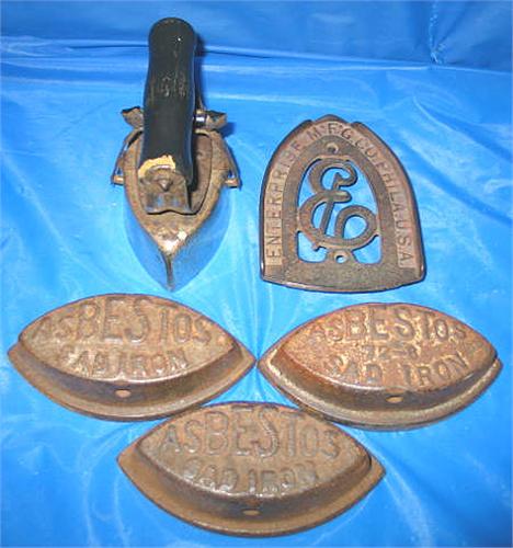 ENTERPRISE IRON W/IRON HANDLE, BASE & (3) ASBESTOS SAD IRON INSERTS