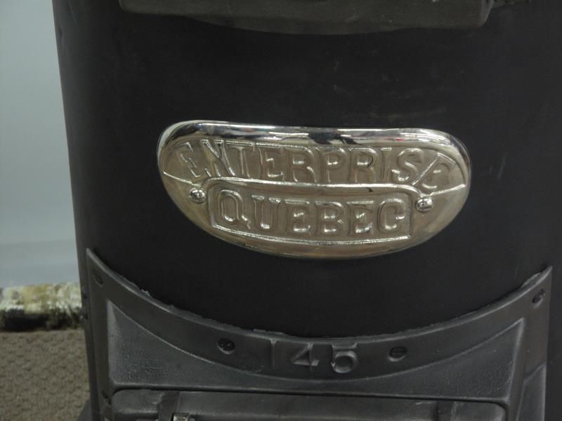 -Enterprise Quebec pot belly stove recently refinished with chrome accent pieces.