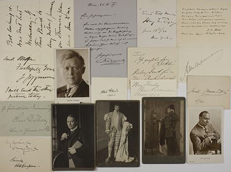 A nice group of 13 pieces by prominent European, British and American stage actors, actresses and operatic stars, in various formats (noted): HENRY E. DIXEY (signature); JOSEPH JEFFERSON (A.L.S.); HANS DUHAN (signature); CHARLES RICHMAN (signature); BETTY COMPSON (signature); MAUDE ADAMS (signature); BERNHARD BAUMEISTER (signature); EMIL JANNINGS (S.P.); WERNER KRAUSS (S.P.); ALBERT BASSERMANN (signature), and two others not identified. Along with three handsome cabinet photographs of actors by Henri Manuel of Paris, one of which depicts Sarah Bernhardt in "Les Boussons". Very good condition.