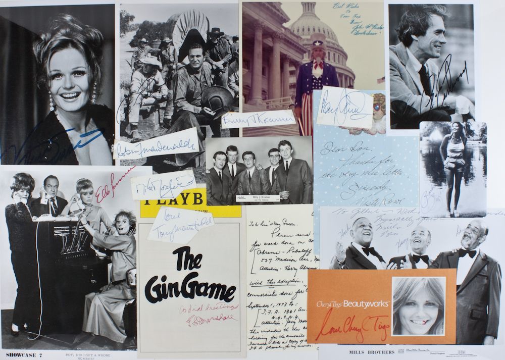 A group of 15 signatures of celebrities, in various formats (noted), includes: CLINT EASTWOOD (two S.P.s: a 5" x 7" b/w side profile shot, and an 8" x 10" b/w shot from a scene in a Western); BARBI BENTON (small. S.P.); CHERYL TIEGS (signature on a sheet from her cosmetics line); VALERIE PERRON (S.P. 8" x 10" b/w); JOHN H. RUSK (S.P. 8" x 10" color, showing him as Uncle Sam on the White House steps); ELKE SOMMER (S.P. 8" x 10"); GEORGE C. MARSHALL (signed Playbill cover); THE MILLS BROTHERS (S.P. 10" x 8" promotional shot); LLOYD BRIDGES (A.L.S. 1973); MISTY ROWE (A.N.S.); and signatures of members of Billy J. Kramer and the Dakotas. Very good condition.
