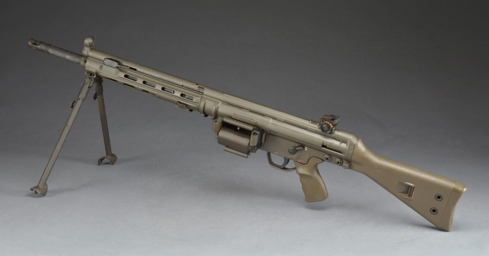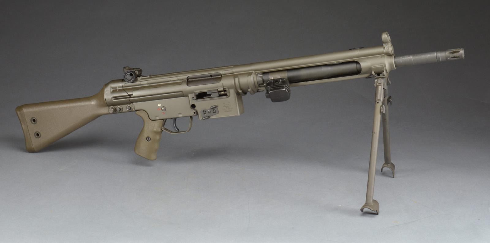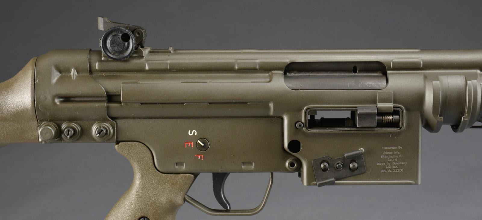 Cal. 308. S# A047627. Bbl. 17.7". The HK21 is often thought the pinnacle of a serious HK collection. A heavy bbl. MG w/ quick change capability; this belt fed masterpiece is as uncommon as it is desirable. Starting life as a registered receiver HKG3, originally converted by Fleming Firearms, this example has undergone the tedious and exhausting transformation at Vollmer mfg. into the highly coveted HK21. All external metal surfaces are parkerized & furniture is dark, jungle green. Quick change bbl. is terminated w/ the factory flash hider. The bipod mechanism can be utilized either on the muzzle end in a traditional fashion or just forward of the receiver where corresponding slots exist for both. Traditional hooded front post sight & 1200m rear peep sight. Trigger group is housed in a metal SEF lower. The proper HK21 stock is utilized including the tripod mounting point, rear of the takedown pins. Markings include left side data plate above belt feed mechanism, which reads: “HK21 A047627” & right side on belt feed mechanism: “Conversion by / Vollmer MFG. / Bloomington ILL. / HK91 / Made in Germany / HK Inc. / Arl. VA. 22201”. UNATTACHED ACCESSORIES: spare ejector & firing pin. Original Vollmer operators manual. Contract paperwork. CONDITION: all outward aspects of this firearm appear as new. Aside from internal areas of thinning finish where mechanical intervention, including assembly, removes excess finish. There is very little indication of any range time beyond test firing. Fire control group appears to function correctly when cycled by hand. Bore is shiny w/ strong rifling. NATIONAL FIREARMS ACT MG REQUIRING BATF TRANSFER BEFORE TAKING POSSESSION. FULLY TRANSFERABLE. (03-1471/JZ). MODERN CLASS III. $18,000-28,000.