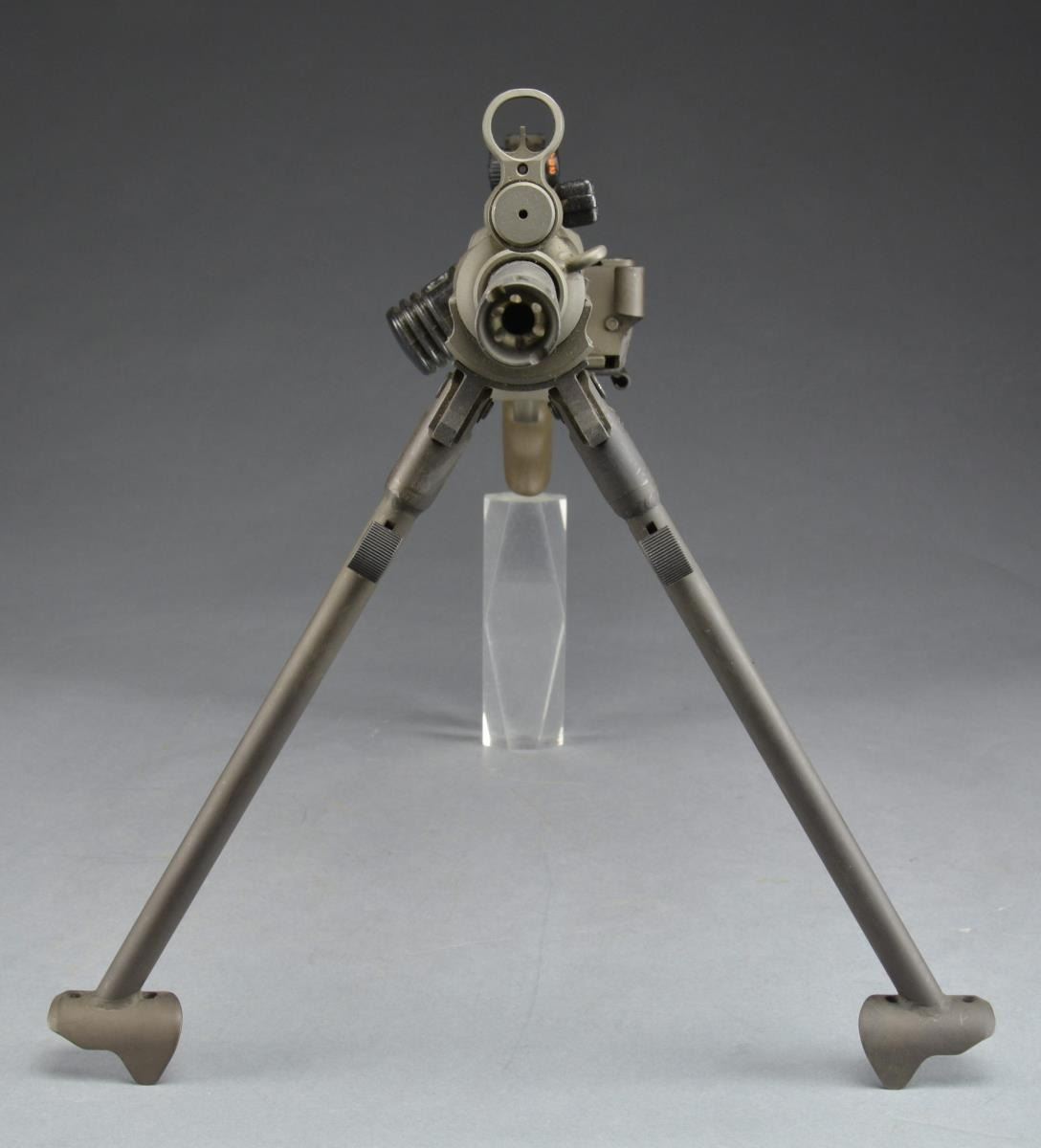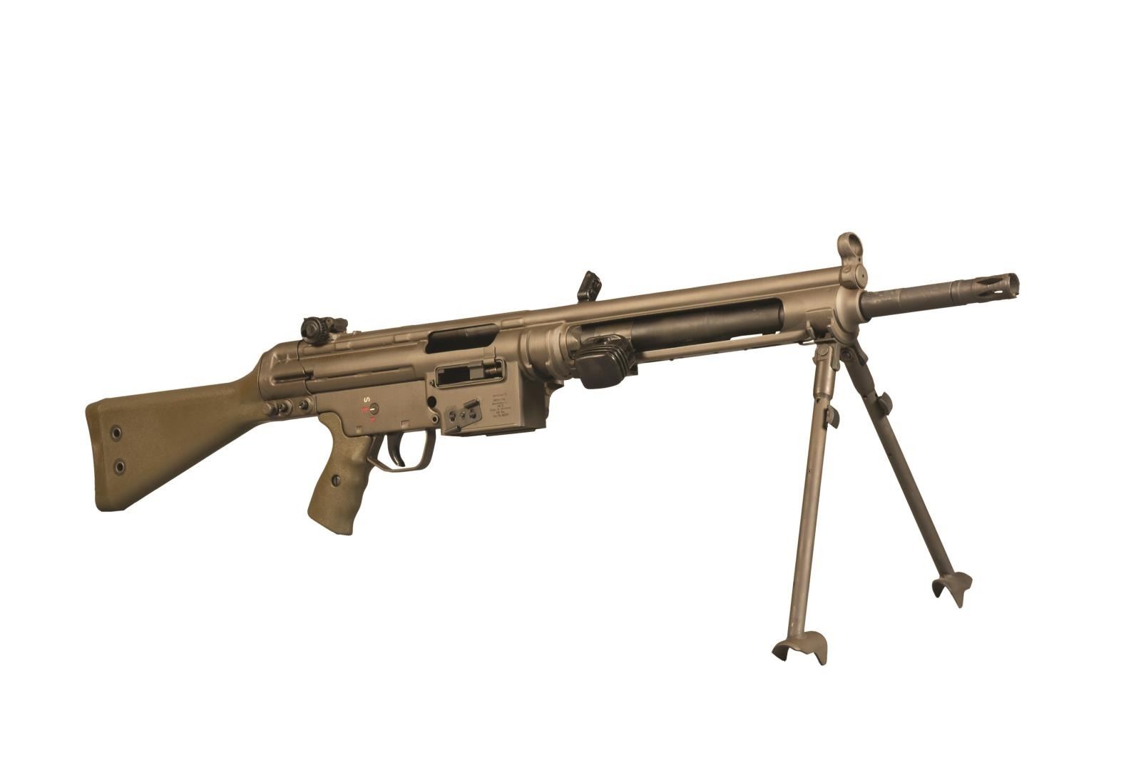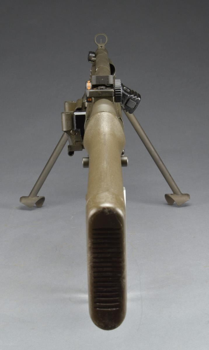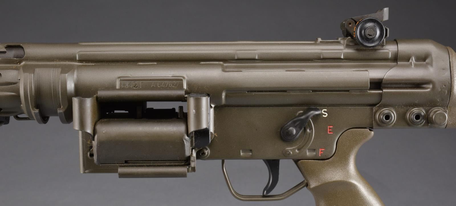 Cal. 308. S# A047627. Bbl. 17.7". The HK21 is often thought the pinnacle of a serious HK collection. A heavy bbl. MG w/ quick change capability; this belt fed masterpiece is as uncommon as it is desirable. Starting life as a registered receiver HKG3, originally converted by Fleming Firearms, this example has undergone the tedious and exhausting transformation at Vollmer mfg. into the highly coveted HK21. All external metal surfaces are parkerized & furniture is dark, jungle green. Quick change bbl. is terminated w/ the factory flash hider. The bipod mechanism can be utilized either on the muzzle end in a traditional fashion or just forward of the receiver where corresponding slots exist for both. Traditional hooded front post sight & 1200m rear peep sight. Trigger group is housed in a metal SEF lower. The proper HK21 stock is utilized including the tripod mounting point, rear of the takedown pins. Markings include left side data plate above belt feed mechanism, which reads: “HK21 A047627” & right side on belt feed mechanism: “Conversion by / Vollmer MFG. / Bloomington ILL. / HK91 / Made in Germany / HK Inc. / Arl. VA. 22201”. UNATTACHED ACCESSORIES: spare ejector & firing pin. Original Vollmer operators manual. Contract paperwork. CONDITION: all outward aspects of this firearm appear as new. Aside from internal areas of thinning finish where mechanical intervention, including assembly, removes excess finish. There is very little indication of any range time beyond test firing. Fire control group appears to function correctly when cycled by hand. Bore is shiny w/ strong rifling. NATIONAL FIREARMS ACT MG REQUIRING BATF TRANSFER BEFORE TAKING POSSESSION. FULLY TRANSFERABLE. (03-1471/JZ). MODERN CLASS III. $18,000-28,000.