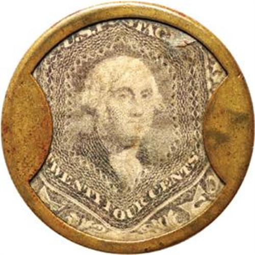 A lovely example of this extremely difficult to obtain, high 24¢ denomination. Luckily for denomination set collectors, this is the most common and affordable of all merchant types and varieties. This stamp is nicely centered but ever-so-lightly faded. It is seen under clear mica that shows a minor crack near the upper right edge. The case is a medium chestnut in color and is nearly free of any noticeable detractions. An impressive piece for the Encased Postage Stamp denomination set collector needing this elusive, 24¢ denomination.
