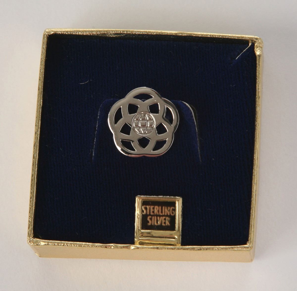(Epcot, 1982) Sterling tie tac celebrating the grand opening of the EPCOT Center. Features the EPCOT logo and comes in its original box. Tac measures 0.6"x0.6". In good condition.