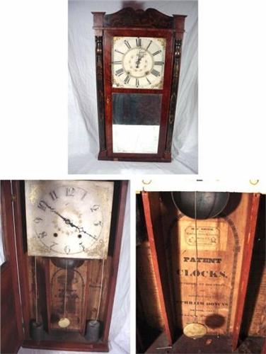 EPHRAIM DOWN WOODEN WORKS STENCIL COLUMN AND SPLAT; BRISTOL, CT. BRONZE LOOKING GLASS; ALL ORIGINAL BUT NEW LATCH; 1830'S EHRHARDT VOLUME 4 PAGE 112. TIME AND STRIKE 30 HR. 32.5"X17"X4.75". VALUATION: 450-600 USD.