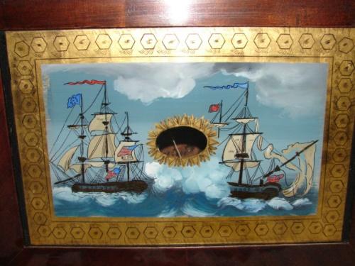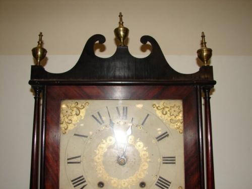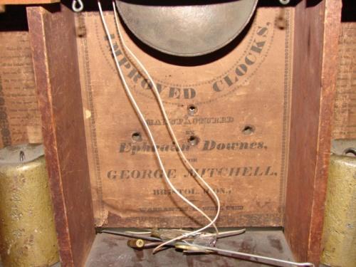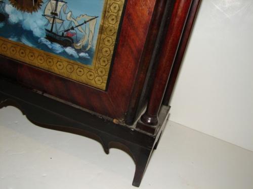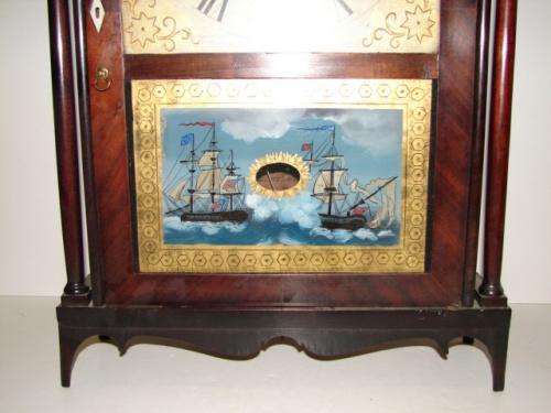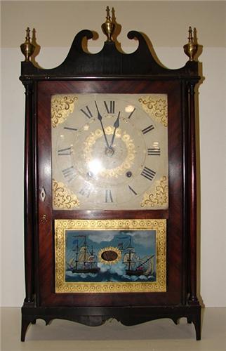 EPHRAIM DOWNES PILLAR & SCROLL SHELF CLOCK. Early 19th century. With reverse-painted glass tablet of Naval battle, painted face, and ivory escutcheon. Not running. Finials replaced. Tablet probably original but reattached. Works included. 31.25” tall to top of brass finial.