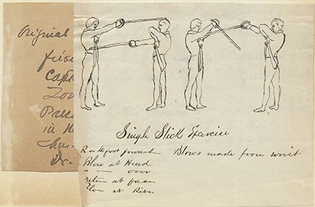 (1837-1861) Union officer and a close friend of Lincoln, leader of "Ellsworth's Zouaves", killed by a hotel owner in Alexandria after tearing down a Confederate flag which had flown above the hotel. A unique item, an original sketch by Ellsworth in ink on a 4 3/4" x 4" sheet. Titled in his hand "Single Stick Exercise", it depicts men training with swords. Ellsworth notes at bottom: "R or L foot forward Blows made from wrist Blow at Head...return at face, Blow at Ribs...". Tipped to a vintage album sheet, upon which is affixed a note of provenance: "Original sketch by Col. E. E. Ellsworth first man shot in war of Rebellion Captain of the celebrated 'Ellsworth's Zouaves'. Presented by his parents at his old house in Mechanicsville N.Y. to Rev. Chas. Townsend, & by him to Dr. Wakeley". Ragged left edge with a bit of toning thereon, otherwise very good.