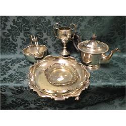EPNS: a salver with pie-crust edge, a sugar basket, teapot, circular dish with pie-crust rim, a sweetmeat dish and a 2-handled trophy cup.