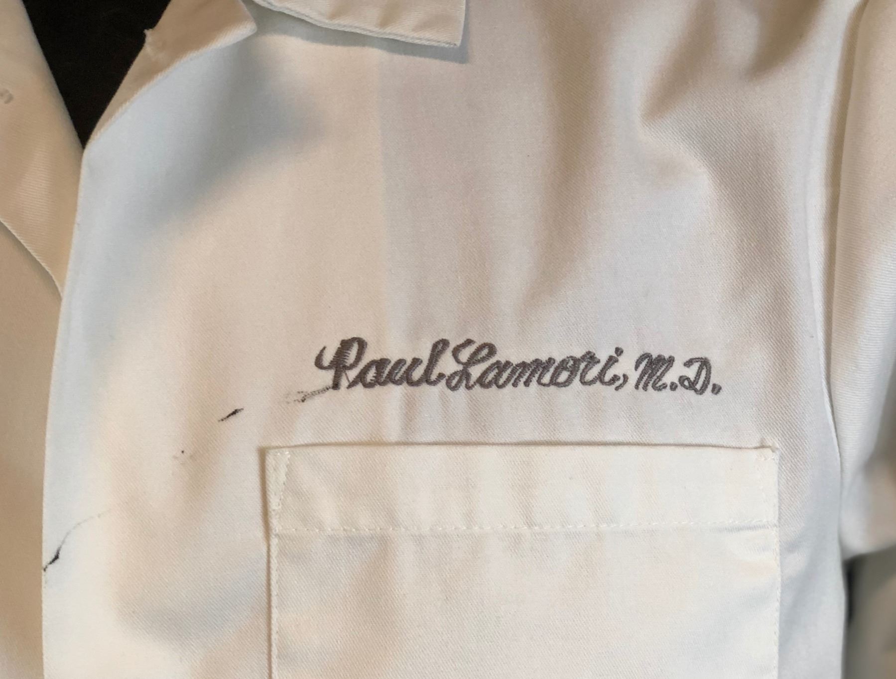 Has the character name "Paul Lamoti M.D." stitched on the breast.