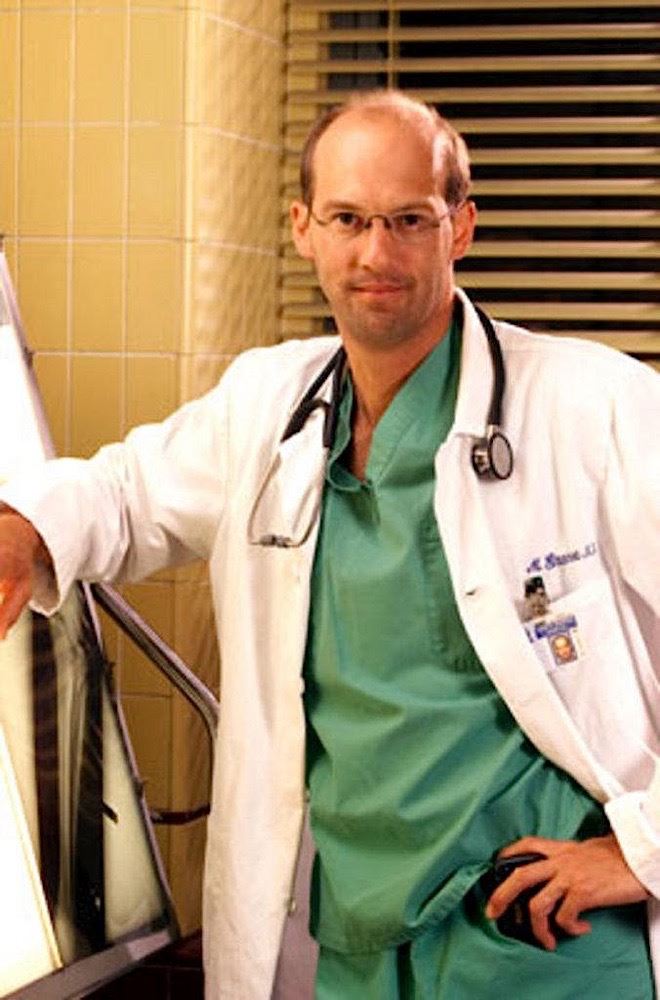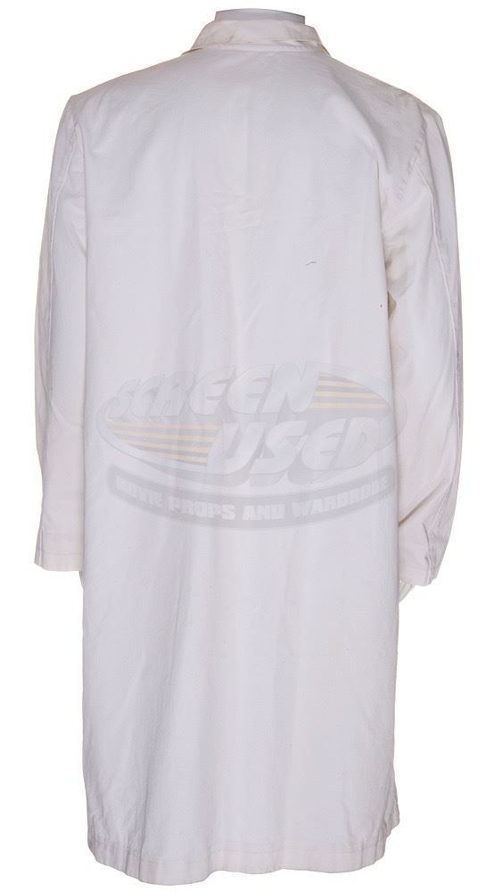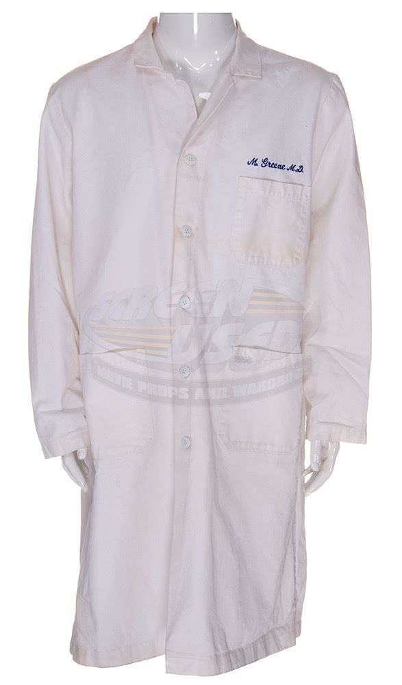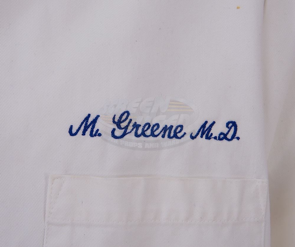 (NBC-TV, 1994-2009) This medical coat was acquired for the production for use by Anthony Edwards as Dr. Mark Greene. It is a long white lab coat made by Cherokee, size 44 with the name "M. Greene, M.D." embroidered in blue thread above the left breast pocket.