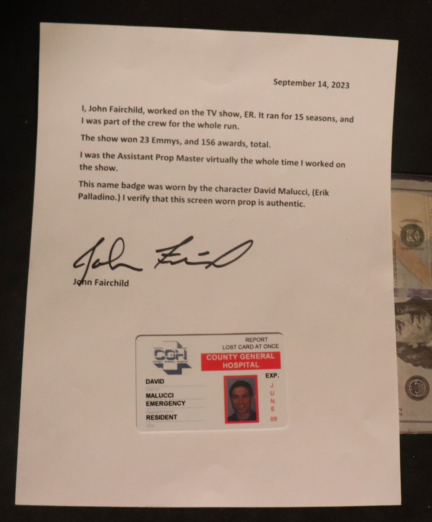 ER TV DAVID MALUCCI HOSPITAL ID BADGE WITH LOA!