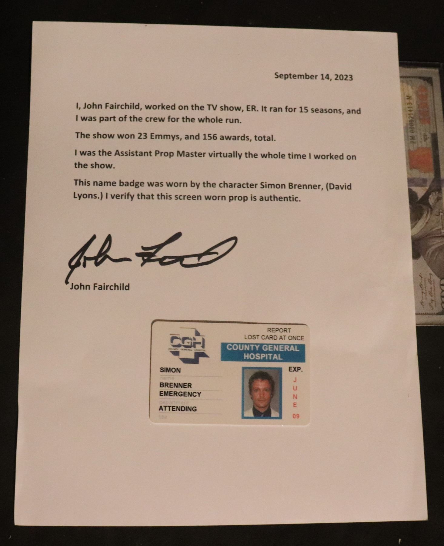 ER TV SIMON BRENNER HOSPITAL ID BADGE WITH LOA!