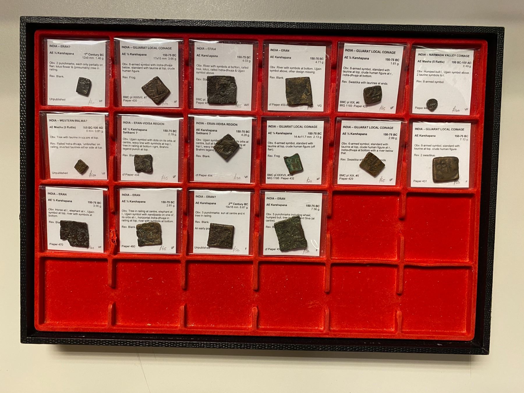 ERAN (VIDISHA), etc.: LOT of 16 copper coins, including Eran (9 pcs, with 6 of the large size, 2 middle size, and 1 small size, average Good to Fine condition, several with modest porosity); Narmaa Valley (1, small, 0.49, VF); Western Malwa (1, small, 0.81g, nice VF); and Gujarat local coinage (5 pcs, average Fine, some with defects); all with Todd's description; retail value $400, lot of 16 pieces, ex Ian Todd Collection. Pieper references are to his old 2013 catalog.