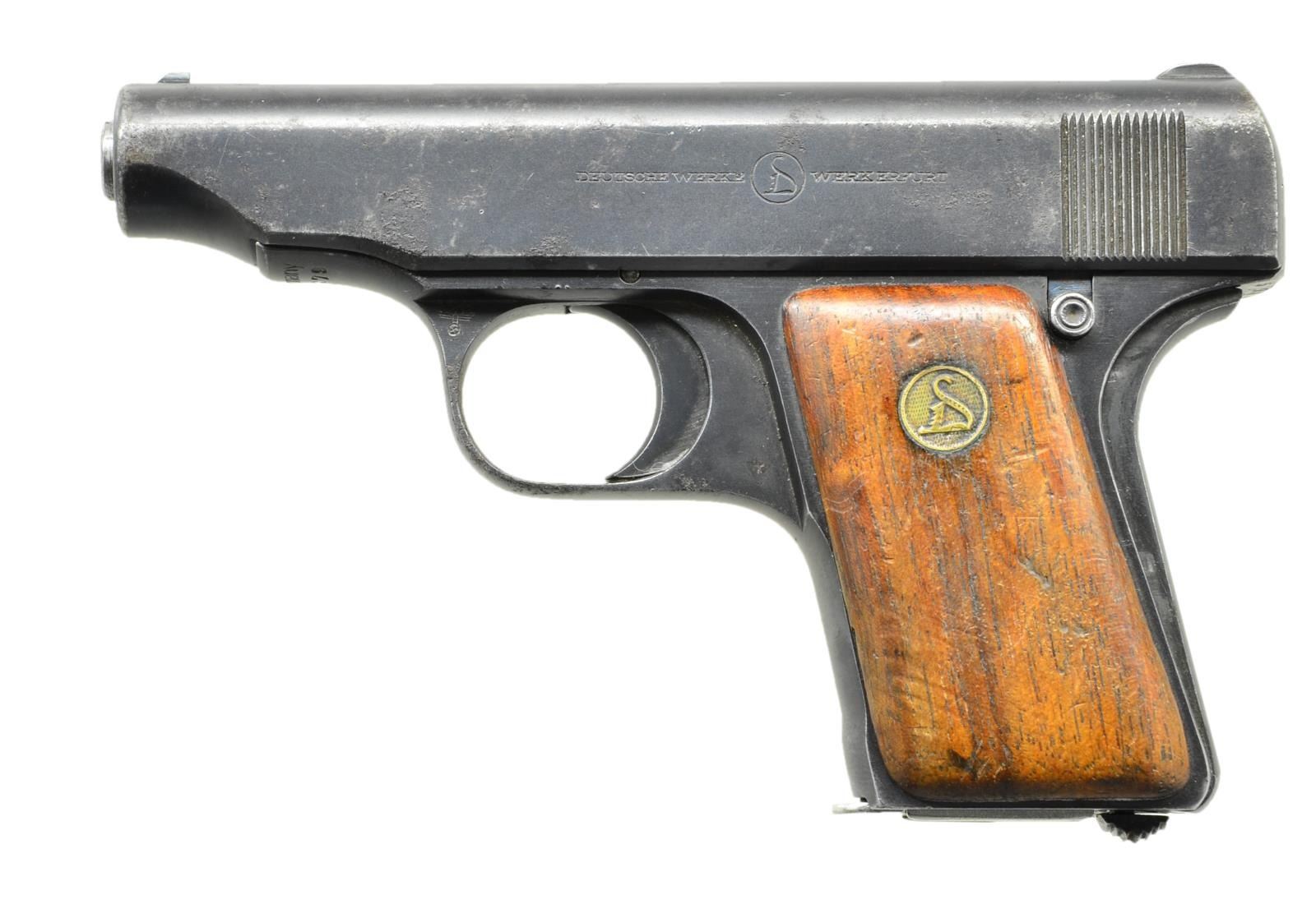Cal. 6.35mm (25 ACP). S # 83279. Bbl. 2 3/4". Frame marked "GERMANY" below S #. Left side of frame marked "DEUTSCHE WERKE WERKE ERFURT". Right rear of slide and left front of triggerguard both marked w/ a WW2 German eagle. These markings are likely spurious. Right side of slide marked "ORTGIES PATENT". Right side of frame marked w/ crown over N proof. Smooth walnut grips w/ Deutsche Werke logo. MAGS: 1-6 rd marked w/ Deutsche Werke logo and "Cal. 6.35". CONDITION: grips show some staining, dings and scratches. Metal retains 50% original blue w/ scattered oxidation, thinning and scratches. Very good bore. (22-3162/MJC). CURIO. $200-300.