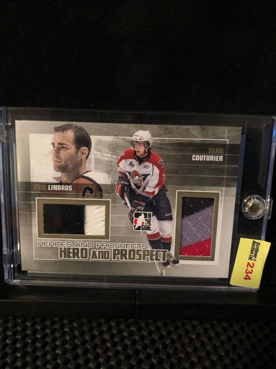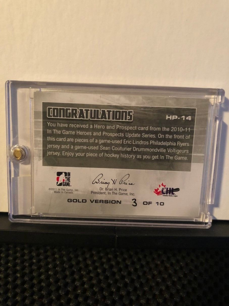 ERIC LINDROS, SEAN COUTURIER 2010-11 ITG HEROES & PROSPECTS UPDATE SERIES DUAL GAME USED JERSEYS 3 OF 10 GOLD VERSION