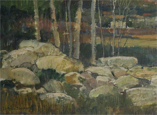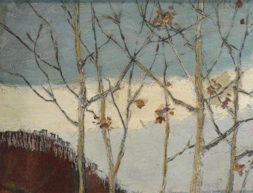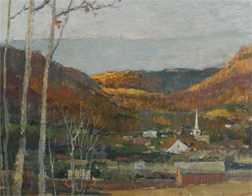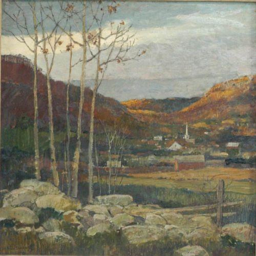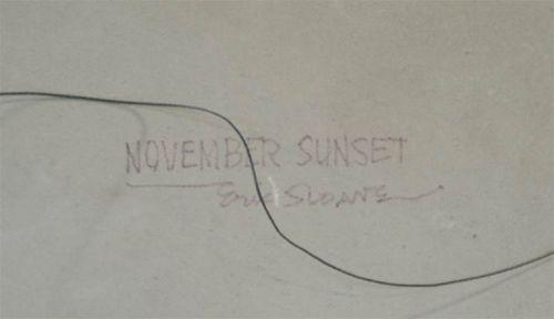 ERIC SLOANE, 19 1/2"x19 1/2" oil on masonite, "November Sunset", signed ll, signed and titled verso, a gift from the artist to the current owner, condition: excellent- no damage or repairs.